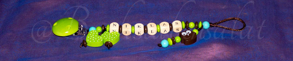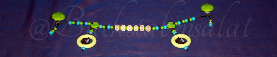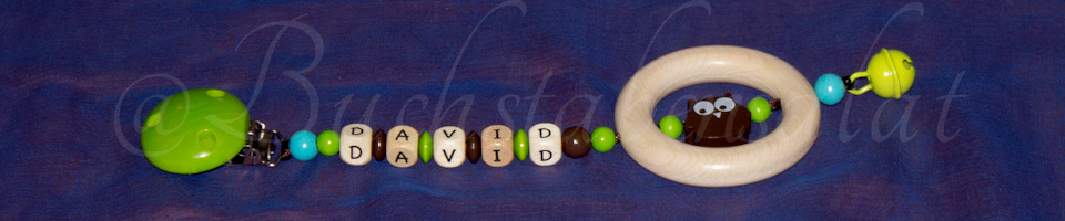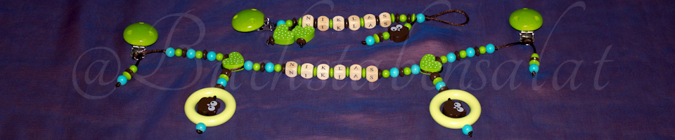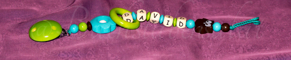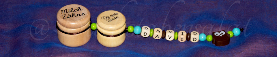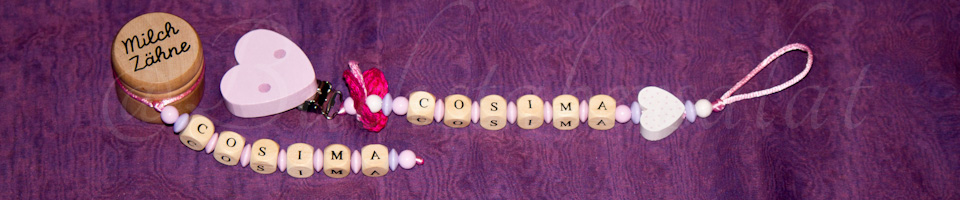 Zum Beispiel eine Schnullerkette und ein Andenkendöschen, oder eine Schnullerkette, die passende Kinderwagenkette und den Schlüsselanhänger für die Mama.